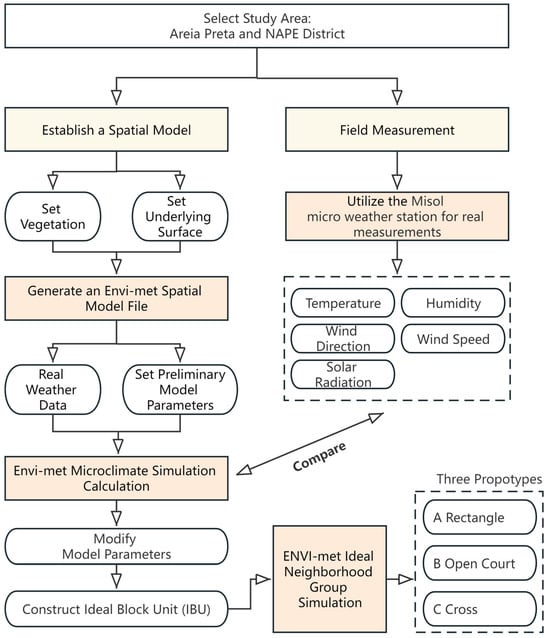 This framework (Figure 6) outlines a methodical approach to microclimate study in urban environments, focusing on the Areia Preta and NAPE District. Initially, it involves selecting a specific study area and establishing a spatial model, incorporating vegetation and surface characteristics. Field measurements are then conducted using a Misol micro weather station, gathering real-time data on temperature, humidity, wind direction, and speed, as well as solar radiation. These empirical data are used to generate an ENVI-met spatial model file, integrating real weather data and preliminary model parameters. Following the ENVI-met microclimate simulation, the results are compared with three architectural prototypes—Rectangle, Open Court, and Cross—to assess their impact on the microclimate. Based on this comparison and further modifications to model parameters, an Ideal Block Unit (IBU) is constructed, leading to an ideal neighborhood group simulation. This comprehensive process aims to optimize urban design for enhanced environmental performance and human comfort.