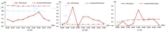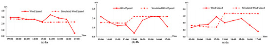 In configuring the basic meteorological parameters for our model, we utilized actual weather data from 11 May 2021. This dataset included a low temperature of 26.4 °C, a high temperature of 31.0 °C, an average wind speed of 3.61 m/s, and a prevailing wind from the south (i.e., wind direction angle of 180°). We conducted a comparative analysis of wind speeds measured and simulated from 9 AM to 5 PM at locations to (the specific field measurement and model simulation data can be found in the Supplementary File). Figure 7 illustrated the wind speed comparison of measured data and simulated results at points to . In subplot (a) for , the measured wind speed shows a general decrease throughout the day, whereas the simulated wind speed slightly fluctuates but generally stays close to the measured values.