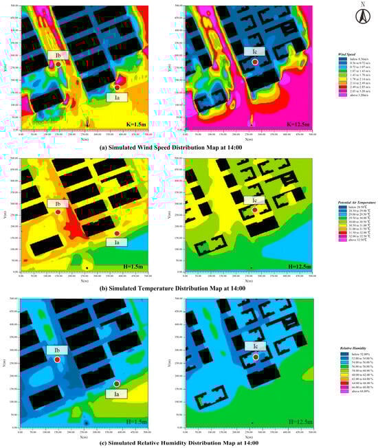 Simulated Distribution Map at 14:00. (a) Simulated Wind Speed Distribution Map at 14:00, (b) Simulated Temperature Distribution Map at 14:00, (c) Simulated Relative Humidity Distribution Map at 14:00.
