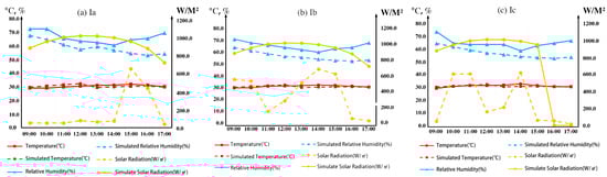 Moreover, we conducted a comparison of the measured and simulated parameters concerning the thermal environment from 9 a.m. to 5 p.m. at locations to , aiming to enhance our understanding of how well the simulation performs, as depicted in Figure 9. Firstly, analyzing temperature and relative humidity, we observed a high level of agreement between the simulated and measured values at each location, which suggests that the model is quite accurate in these aspects. However, a significant gap is present between the simulated and actual measurements of solar radiation, pointing to a potential area for model optimization in accurately predicting solar radiation. The observed differences can be attributed to several factors such as model assumptions and simplifications, boundary conditions, spatial and temporal resolution, data collection inaccuracies, and transient effects.