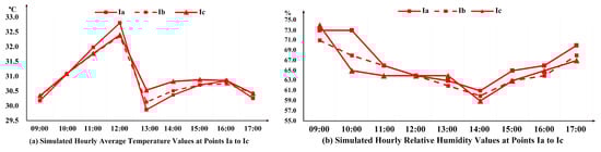 Simulated Temperature and Relative Humidity at Points to (a) Simulated Hourly Average Temperature Values at Points Ia to Ic, (b) Simulated Hourly Relative Humidity Values at Points Ia to Ic.