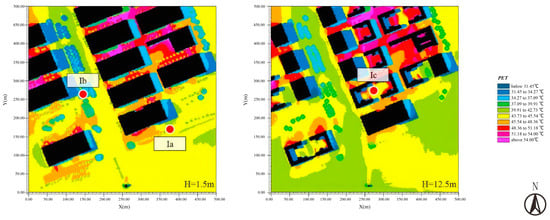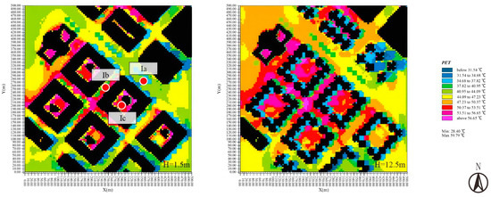 Further analysis of the hourly simulated temperature and relative humidity at each measured point from to (Figure 10a) reveals minor differences in temperature and relative humidity among these points. This indicates that the impact of spatial configuration on temperature may be limited [28]. Shifting focus to the simulated relative humidity at each point (Figure 10b), an overarching pattern emerges of an initial decrease followed by an increase. In conclusion, the analysis of the simulated PET (Physiologically Equivalent Temperature) readings across various locations (Figure 11), reveals a trend towards high values. This inclination towards higher PET values appears to be a consequence of the increased simulated daily temperatures combined with discrepancies in the calibration of the clothing index. Despite this bias, the spatial distribution patterns of PET offer critical insights and hold significant relevance for reference.