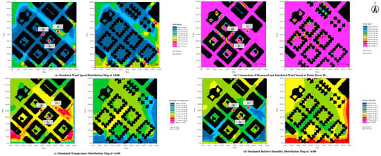 Simulated Distribution Map at 14:00. (a) Simulated Wind Speed Distribution Map at 14:00, (b) Comparison of Measured and Simulated Wind Speed at Points IIa to IIc, (c) Simulated Temperature Distribution Map at 14:00, (d) Simulated Relative Humidity Distribution Map at 14:00.