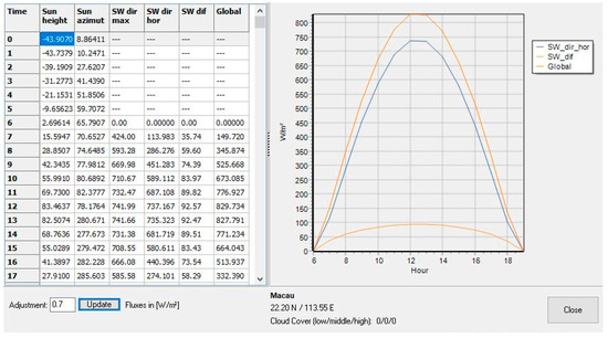 Through onsite collection of microclimate data, our findings not only revalidated the effectiveness of using ENVI-met as our primary tool for microclimate simulations but also highlighted adjustments needed in the simulation parameters of the software [33]. We have established more accurate meteorological settings. We chose 180° S (south wind) for the wind direction of the summer monsoon in the Macao Peninsula, set the average wind speed at 2.5 m/s, and defined the outdoor temperature range between 25 °C and 31 °C. By comparing onsite solar radiation measurements with those generated by the software, we concluded that the solar radiation parameter in ENVI-met should be adjusted to 0.7 times its original preset value, as illustrated in Figure 17. This calibration was specific to the study area of Macau and may not directly apply to other urban areas due to differences in local environmental conditions, but should apply to other high-density cities in the Lingnan area.