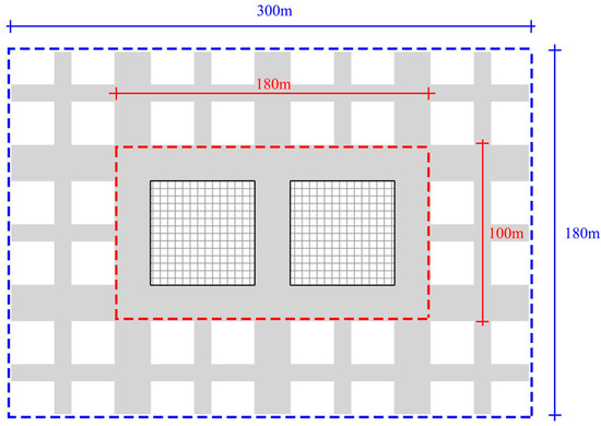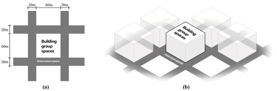 The Ideal Block Unit’s composition is depicted in Figure 18a, including solely building group areas and street canyon spaces. The dimensions for the interior building group space are limited to 60 m by 60 m, whereas the external street canyon space width is determined to be 20 m. Inside the building group space, it is possible to create two or three alleyways, with a stipulation that their widths do not surpass that of the outer street canyon space. The height of the unit is flexible, allowing for adjustments based on specific needs. By varying the layout of alleys and building configurations in the building group space, this Ideal Block Unit enables the creation of a diverse range of spatial models for ideal blocks. For this study, the ideal block model comprises two building group spaces and their adjacent street canyon spaces, serving as the focal points for a microclimate simulation experiment. The designated spatial extent for this experiment spans 180 m by 100 m. To enhance the accuracy of the ENVI-met simulation data, the simulation’s spatial boundary was extended by approximately 50 m beyond the observational area, resulting in a total spatial dimension of 300 m by 180 m. The gap between the simulation and observation areas was filled with multiple building group spaces to emulate a simplified urban setting around the simulated block. Reflecting the architectural style found in the Macao Peninsula’s reclamation area, a square array formation was adopted for the building groups surrounding the experimental area, as illustrated in Figure 18b.