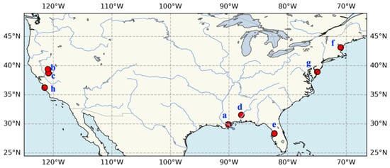 We selected eight coastal stations, which exhibited different levels of trends in the previous study [], in the United States. The geographic locations of the gauges in these cities are displayed in Figure 1. The information about these eight gauges is summarized in Table 1. We focus on extreme rainfall, which is determined as the annual maximum precipitation, with two different durations, namely 1 h and daily. The hourly data for the period of 1960–2021 were obtained from NOAA (https://www.ncei.noaa.gov/maps/hourly/) (accessed on 12 December 2024), while the daily data were calculated from the hourly data.