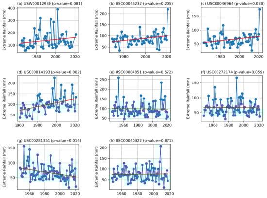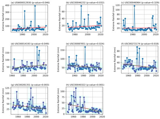 Trend analysis of the annual maximum daily rainfall of selected stations. The blue dotted lines are the observations, and the red line is the estimated trend.