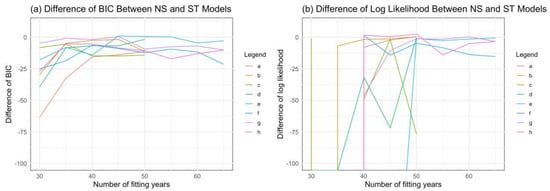 Difference in BIC between NS and ST models, i.e., BIC_NS—BIC_ST, during the fitting period (a); difference in log-likelihood between NS and ST models, i.e., (log-likelihood_NS)—(log-likelihood_ST) (b).