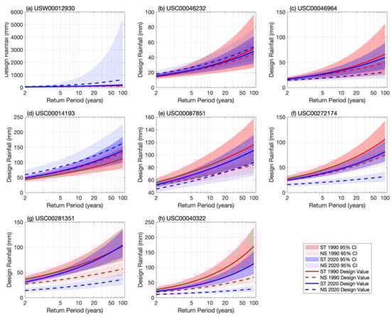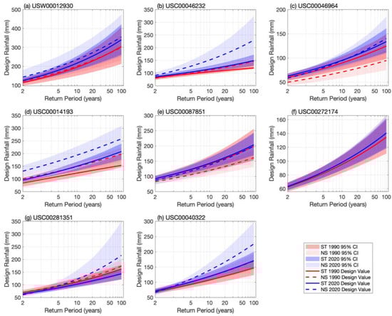 Typically, researchers used the concept of the effective return level (ERL) to estimate nonstationary design rainfall. For the ERL, the 95th percentile of estimated parameters during the observation period is used to calculate the future design rainfall. In this study, we aim to highlight the impacts of a nonstationary/time-varying distribution on the design precipitation. So, when using the nonstationary (NS) models, we calculated the design rainfall for the full record and used the parameter in the years 1990 and 2021 to estimate the NS design values, respectively. Meanwhile, when using the stationary (ST) models, we used observations for the period with a start from about 1960 to 1990 (varying case by case) to estimate the ST design rainfall in 1990 and used the observations for full records to estimate the ST design rainfall in 2021, which is consistent with the practice of engineering design. Equally, the uncertainty of design rainfall is estimated using the bootstrap method. The above experimental design allows for a fair comparison between the NS and ST design values.
