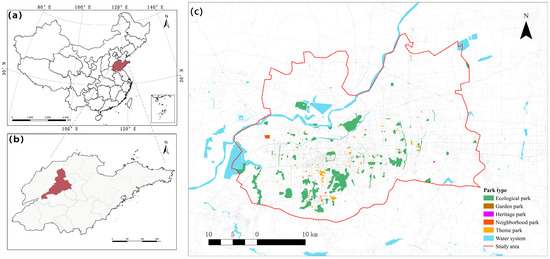 This study selects Jinan (36°40′ N, 117°00′ E), a typical temperate monsoon climate city, as the research site. Jinan experiences hot and humid summers and cold and dry winters. During the hottest months, the average temperature can reach 27 °C, while the coldest month has an average temperature of only −1 °C. The annual precipitation is approximately 685 mm, with over 60% of it concentrated in the summer months (https://weather.cma.cn) accessed on 10 June 2023. These climate characteristics make the urban heat island effect in Jinan particularly pronounced, and the demand for cooling and carbon reduction functions in urban parks is urgent under extreme heat conditions. Urban green spaces can effectively lower the surrounding environmental temperature and improve the urban microclimate [3,7,23]. Therefore, the study focuses on 369 urban parks in Jinan, with park sizes ranging from 0.18 hectares to 848.2 hectares. Based on the latest urban green space classification standards, the parks are categorized into the following types: theme parks, heritage parks, ecological parks, community parks, and small recreational parks (Figure 1). These parks not only provide recreational spaces for residents but also play a significant role in improving the urban environment and enhancing ecological quality [24]. The study date was chosen as 10 June 2023, which is a typical summer period with the best data source and a typical day for extreme heat events. The data used in this study are provided in Table 1.