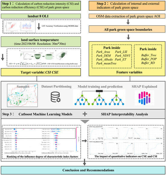 This research utilizes a three-dimensional cumulative model to quantify the carbon reduction capacity of urban park green spaces. The model offers an in-depth evaluation of the spatial distribution of carbon reduction resulting from cooling effects and establishes a comprehensive carbon reduction indicator framework. Furthermore, interpretable machine learning methods, including CatBoost and Shapley Additive Explanations (SHAP), are applied to investigate the spatial mechanisms driving carbon reduction in urban park green spaces. The research methodology proceeds as follows (see Figure 2): Initially, the Radiative Transfer Equation (RTE) algorithm is employed to extract land surface temperature (LST) from Landsat 8 OLI data. MODIS data are then used to assess the accuracy of the LST. By merging these datasets, an integrated evaluation system is developed. Subsequently, a visual interpretation of the parks within the study area is performed to calculate the relevant impact indices. Lastly, interpretable machine learning techniques are applied to quantitatively analyze the relative contributions and mechanisms of the factors influencing the carbon reduction potential of urban green spaces.