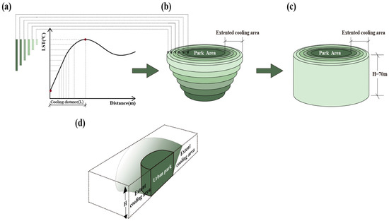 The carbon reduction potential is quantified in terms of carbon emissions, and a cumulative carbon emission model based on the park’s cooling curve is used, as shown in Figure 3b–d. The LST increases from the center of the park outward, along with greater cumulative carbon reduction. The formula for cumulative carbon reduction is provided in Equation (10).