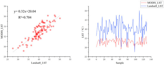 To improve the reliability of the surface temperature results, we cross-validated the surface temperature results inverted from Landsat-8 TIRS data by using MODIS surface temperature products. In ArcGIS, 100 random points were generated, and the LST retrieval results for each urban point were compared to assess their relationship, as shown in Figure 4. The LST retrieval results from the random points were consistent and highly correlated (R2 = 0.704), with a root mean square error (RMSE) of 7.7410, a mean absolute error (MAE) of 7.2480, and a bias of 7.2071. These metrics indicate that the interpolation method provides reliable accuracy. Although the spatial resolution of MODIS data is lower, after reasonable interpolation, high-resolution data can still be used for accurate LST comparisons. Overall, we conclude that the LST retrieval results employed in this study are valid and can be applied to LST-based cooling and carbon reduction research.
