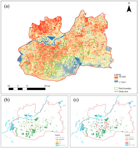 The intensification of global climate change, particularly the rise in greenhouse gas emissions, has exacerbated the urban heat island (UHI) effect, which has profound implications for urban living conditions [1,2]. UHI not only leads to significantly higher temperatures in urban areas compared to surrounding rural regions but also intensifies energy consumption, particularly during the summer when increased air conditioning use further escalates carbon emissions [3,4]. Therefore, mitigating the UHI effect has become a critical priority for improving urban environmental quality, reducing energy demand, and enhancing thermal comfort for residents [5,6]. Numerous studies have shown that urban parks and green spaces, as essential components of urban ecological infrastructure, play a crucial role in reducing urban temperatures through mechanisms such as plant transpiration and shading, which help mitigate the UHI effect [7,8]. Furthermore, urban parks contribute significantly to reducing air conditioning energy consumption, thereby lowering carbon emissions and demonstrating notable carbon mitigation potential [9,10]. In light of these findings, investigating the cooling and carbon reduction effects of urban parks is of both theoretical and practical importance.