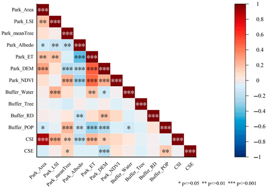 Correlation coefficients between carbon reduction indicators of urban parks and internal and external factors (*** indicates a significance level of 0.001, ** indicates a significance level of 0.01, * indicates a significance level of 0.05).