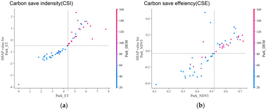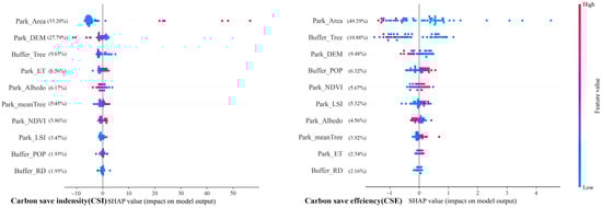 The SHAP values and the corresponding color of sample points further reveal that higher Park_Area values (represented by red) correlate with positive SHAP values, indicating a positive relationship with CSI. On the other hand, lower values of FVC (represented by blue) are associated with negative SHAP values, suggesting that an increase in Park_Area improves carbon reduction intensity (CSI) but decreases carbon-saving efficiency (CSE) in park green spaces. A similar pattern is observed for Buffer_Tree.