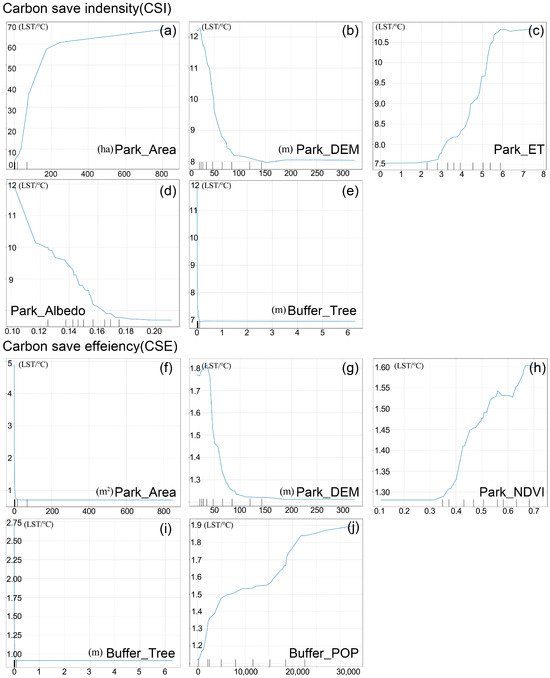 Single-factor feature dependency plot. (a) Park_Area; (b) Park_DEM; (c) Park_ET; (d) Park_Albedo; (e) Buffer_Tree; (f) Park_Area(CSE); (g) Park_DEM(CSE); (h) Park_NDVI(CSE); (i) Buffer_Tree(CSE); (j) Buffer_POP(CSE).