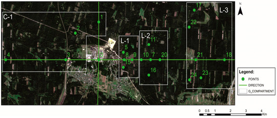 At the HCM site, 20 sampling points were established in pine stands (Figure 1 and Figure 2, Table 1) [26]. The points were located in relation to the main emission source (point 0) at distances of 1640, 2140, 2740, 3340, 3940, and >6000 m (groups L-1, L-2, and L-3, Figure 1). The meteorological conditions, particularly the wind direction, were considered when establishing monitoring points. It was expected that higher foliar S accumulation would occur to the east of the smelter plant based on the meteorological conditions and prevailing wind direction. Therefore, 15 sampling points were established in this area along three lines running north-east, east, and south-east. The basic reference sampling point was Group L-2, at a distance of 2140 m. At this distance, to the east of the smelter, stand mortality was observed and stands had been subjected to sanitary cutting. The concentration of S in pine needles is influenced not only by the activity of the smelter but also by background levels of other pollutants (e.g., from the heating of houses in neighboring towns in winter). Therefore, four control sampling points (C-1) were established to determine background levels of gaseous pollutants. These points were located to the west of the main emission source (against the dominant wind direction).