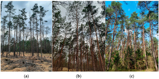 Stands at the FJSM site: degraded (D) area (a); pine (P) stand (b); birch (B) stand (c).