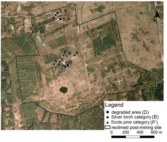 At the FJSM site, sampling was conducted in a reclaimed and forested area, which is now part of the Stale forest. It covers an area of 216.5 ha (Figure 3). The research was conducted in permanent research plots in birch (B)- and pine (P)-dense stands (Phot.2). Foliage samples were also taken in areas classified as degraded (D). The soil in D was characterized by a low pH, high electrical conductivity, and excessive S concentration. These characteristics potentially explain why there was no vegetation in these areas [22]. Plant material was collected from single, stunted trees, usually arranged irregularly on the surfaces, most often on their edges. Foliage collected from the research plots classified as degraded (D) was collected from pine (D_P, three plots) and birch (D_B, one plot) trees (Figure 3 and Figure 4). Tree nutrition in the FJSM area was determined in a previous study [22]. In the present study, needle S concentration was used to investigate industrial pollution in highly S-contaminated habitats.