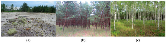 Reclamation and afforestation activities at the FJSM site were carried out during the period 1993–2010. Reclamation consisted of the following: removing the existing infrastructure (including production heads, pipelines, and access roads); regulating hydrological conditions; pH neutralization by liming (400–500 Mg ha−1 of post-flotation lime was used if the S content in the surface soil layer was <3%; a 10 cm layer of post-flotation lime covering was used if the S content was >3%); fertilization (70 kg ha−1 P2O5, 60 kg ha−1 K2O); and sowing a grass mixture [22,23]. In the last stage, the area was forested mainly with one-year-old seedlings of Scots pine (Pinus sylvestris L.) silver birch (Betula pendula Roth), and red oak (Quercus rubra L.) in admixture [22,23]. Despite the reclamation, there are still hotspots with a complete lack or a low degree of vegetation cover. These are places directly related to the location of post-exploitation wells, as well as former post-eruption areas and technological storage sites [18].
