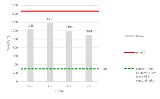 The highest S concentration was found at point 0, located immediately next to the HCM plant (Figure 1, Figure 5 and Figure 6). In the remaining groups, the highest S content in needles was found in group L-1, that is, the points located closest to the east of the smelter plant (Figure 1). Similar concentrations were recorded in the L-2 group and the C-1 group (western control group; Figure 5). The lowest S content was found in the L-3 group (Figure 5 and Figure 6).