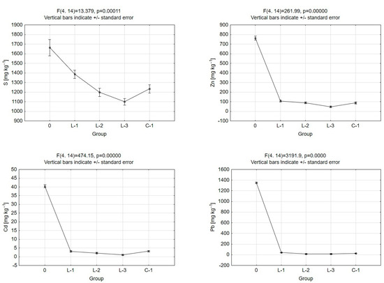 Statistica v.13.3 (Tibco Software, Inc., 2017) [28] software was used for the statistical analyses. The potential correlations between S and other chemical elements (P, K, Ca, Na, Mg, Al, Fe, Mn, Cu, Zn, Cd, and Pb) were calculated with a probability of p > 0.05. One-way analysis of variance was used to compare individual parameters between groups in HCM (0, L-1, L2, L-3, C-1) and FJSM (B, P, D_B, D_P). The HSD Tukey post-hoc test was used to test for significant differences between the analyzed groups.