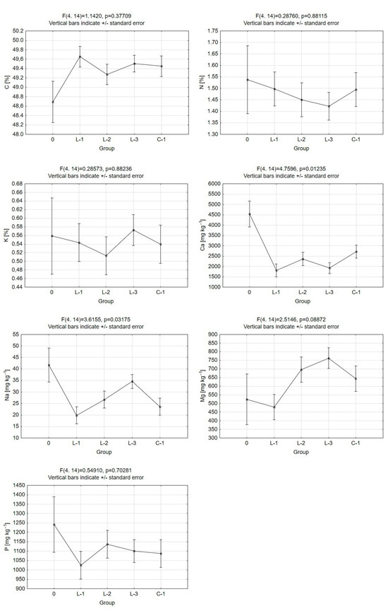 The nutritional values were determined based on the classification of Heinsdorf. At point 0, S was classified as level 3 (sufficient content), and the remaining points were classified as level 2 (low content). The N content was low at all points, and Mg was low at point 0 and in group L-1. The Mg content at the remaining points was sufficient. P content was sufficient (level 3) at all points. K content was good (level 4) at point 0, in the control group, and in group L-1, and sufficient (level 3) in group L-2. The Ca content was very good (level 5) at point 0 and sufficient or good in the other groups (Table 4).