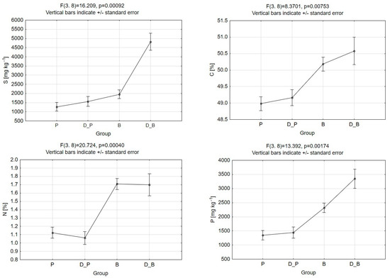 According to Heinsdorf’s classification, pine trees in the regular stand had a low S level (level 2) and pine trees in degraded stands had sufficient S (level 3). Birch in regular stands had sufficient S (level 3), but birch in degraded stands had luxury levels of S (level 5). Contents of C, N, P, Mg, and Ca were higher in birch foliage (B and D_B) than in pine foliage (P, D_P; Table 6). According to Hainsdorf, only N was present at a low level in pine and birch foliage. The levels of the remaining microelements tested ranged from sufficient to luxurious (level 5) in the case of Ca content in birch leaves.