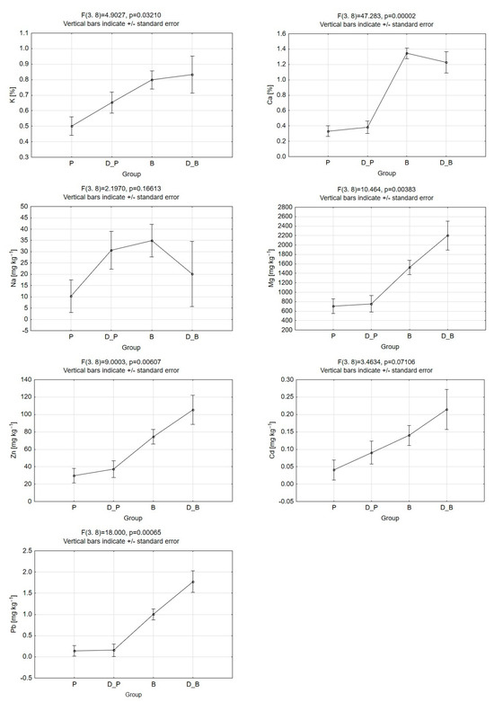 The highest mean contents of all studied elements were recorded in group D_B (Table 6, Figure 7), except for Na, which was higher in groups B and D_P than in group D_B. Element contents were generally higher in the birch trees than in the pine trees (Figure 8).