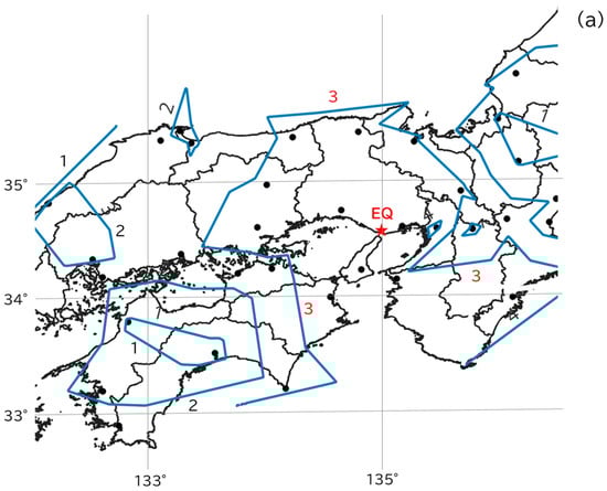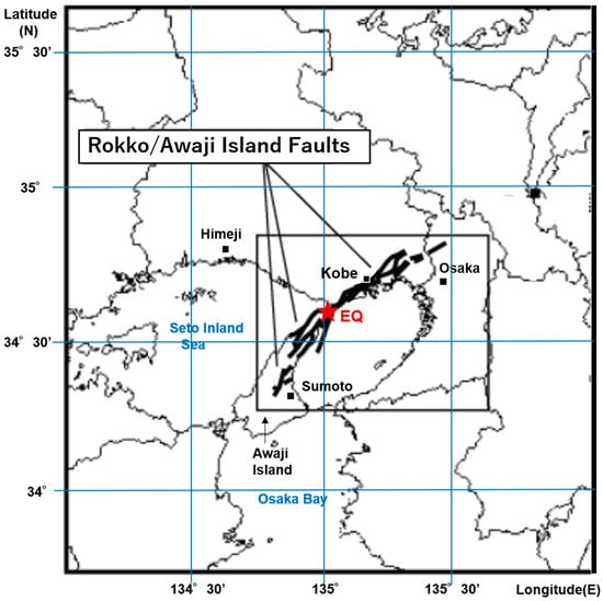 The target EQ of this paper is the famous 1995 Kobe EQ that happened at 5 h 46 m on January (JST) 1995 at the epicenter (geographical coordinates of 34°35.9′ N, 135°02.1′ E) as shown in Figure 1 (red star with notation of EQ) with a M (magnitude) = 7.3 and with a depth of 16 km (e.g., [60]). For this EQ, we discovered the first convincing evidence of ionospheric perturbations four days to one day before the EQ with the subionospheric VLF propagation data from the Omega transmitter at Tsushima to the observatory at Inubo (Hayakawa et al., 1996 [60]); Nagao et al. (2002) [61] also summarized different kinds of electromagnetic EQ precursors for this EQ. Further, we have plotted some AMeDAS meteorological stations close to the EQ epicenter (such Kobe, Himeji, etc.) together with the fault regions possibly related with this EQ.