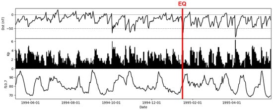 Figure 2 illustrates the temporal evolutions of geomagnetic activity (Dst and Kp index) and solar radiation flux at the wavelength of 10.7 cm (f10.7) during the whole period of 1 May 1994 through 31 May 1995 (over one year) including the day of the EQ, although we think that, unlike ionospheric parameters, the meteorological parameters in this paper are likely to be much less influenced by solar-terrestrial conditions and perturbations. It is seen from the plot of Dst that we notice some geomagnetic disturbances with Dst below −50 nT only in October and November, 1994, but the geomagnetic activity after the beginning of December 1994 till the day of the EQ was extremely quiet, because |Dst| was less than 20 nT. Further, the solar radiation flux (f10.7), as an indicator of overall solar activity levels, was also found to be less than 100. Taking into account the quiet conditions of the solar-terrestrial conditions just before the EQ, we are ready to investigate short-term EQ precursors within the short-term EQ prediction span of one month before and two weeks after the EQ.