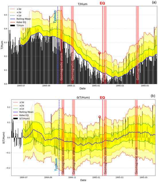 First, we will examine the general behavior of these parameters. Figure 3a (upper panel) illustrates the analysis results (or raw data) for T/Hum during our whole period from 1 May 1994 through 31 May 1995, or 6.5 months before and 5.5 months after the EQ (for a total of more than one year). Each vertical black line indicates the current value for each day and the abscissa indicates the date. The day of the EQ (17 January 1995) is indicated by a vertical red line. There are plotted a few colored curves in the figure; the bottom blue curve refers to the mean value (m), green, m + σ (standard deviation), orange, m + 2σ, and red, m + 3σ. Here, the values of m and σ are estimated during 30 days before the current day as in [22]. The same notations are adopted in the upper panel of Figure 4 for the raw data of ACP. The peak on 10 January 1995 is marked with a red circle on its top. Further, we have included the time periods of geomagnetic storms (though not so strong) (light-red boxes) and a typhoon (blue vertical dotted line) for reference.