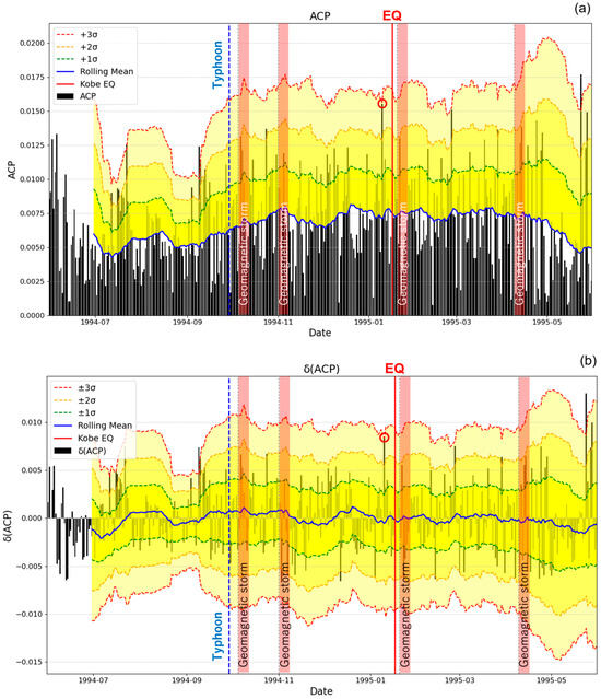 We are interested in short-term EQ prediction, so we pay attention to our time period from about one month before the EQ and two weeks after the EQ. Figure 3b indicates that we can notice a single and a very significant peak exceeding m + 3σ only on 10 January 1995, just one week before the EQ. The value on this anomalous day is indicated by a red circle on the top of the vertical bar. Similarly, we can identify the same anomaly on the same day in Figure 4a,b for ACP, but its value is not exceeding this criterion of m + 3σ, but is well above m + 2σ. As seen from Figure 3a, there are four days exceeding + 3σ; (i) 9 September 1994, (ii) 10 January 1995, (iii) 16 March 1995, and (iv) 24 May 1995, but the origins of those peaks, except for our target of 10 January 1995, are very uncertain, such as temporary climate effects, a local effect, or the effect of non-Gaussian distribution, etc. Nonetheless, the use of this parameter is not so useful as an EQ precursor during summertime, but it will be very powerful during the wintertime (from autumn to spring).