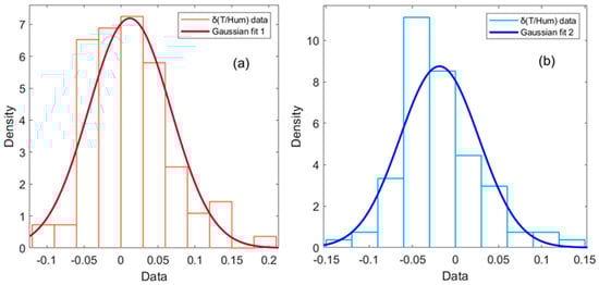 Statistics of δ(T/Hum) data (histogram of values and corresponding Gaussian fitting) over (a) the summer period 1/6/1994–31/08/1994, when the data present a kurtosis k = 3.7757 and were fitted by a Gaussian distribution with a fitting log likelihood of 135.999, and (b) the winter period 1 December 1994–28 February 1995, when the data present a kurtosis k = 4.2870 and were fitted by a Gaussian distribution with a fitting log likelihood of 150.724.