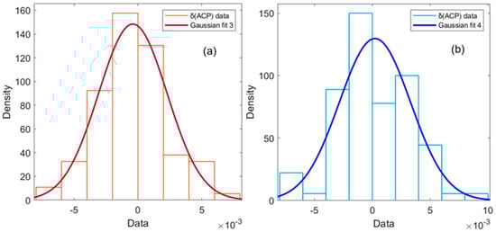 Statistics of δ(ACP) data (histogram of values and corresponding Gaussian fitting) over (a) the summer period 1/6/1994–31/08/1994, when the data present a kurtosis k = 3.2545 and were fitted by a Gaussian distribution with a fitting log likelihood of 414.502, and (b) the winter period 1 December 1994–28 February 1995, when the data present a kurtosis k = 2.8359 and were fitted by a Gaussian distribution with a fitting log likelihood of 393.356.