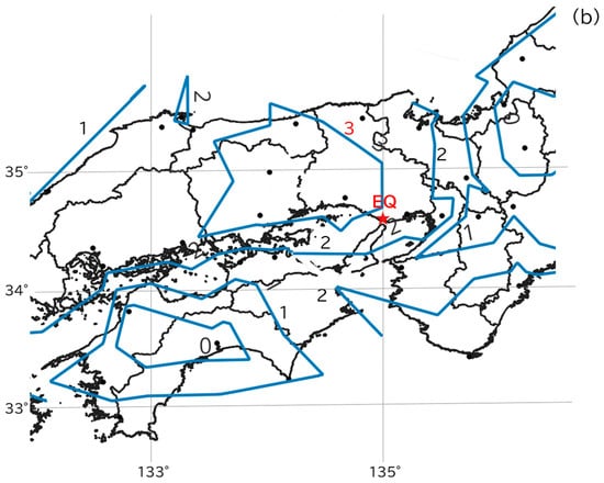 In order to obtain further support to the close relationship of the anomaly on 10 January 1995 to the EQ, we have investigated the spatial distributions of anomaly intensity of both quantities. The anomaly intensity is estimated by the peak value normalized by the standard deviation (σ) at each station and we have used about 40 AMeDAS stations, including the four stations in Figure 1. Figure 7a refers to the spatial distribution of T/Hum, while Figure 7b refers to ACP, in which the studied area is wider than that of Figure 1. The small black dots in the figures represent the locations of AMeDAS stations. The numerical values of 3, 2, etc., are the peak values normalized by the standard deviation (σ), so 3 means 3σ in the figures. It is seen from both figures that the distributions of both quantities are different from each other, and we will describe them one by one. Figure 7a indicates that the area of anomaly intensities exceeding 3σ (3 in the figure) is widely distributed, just encircling the EQ epicenter, and the anomaly intensity decreases at farther distances from the EQ epicenter. For example, the anomaly intensity is very much depleted in the western part of Shikoku Island. As for the case of ACP in Figure 7b, the anomaly intensity exhibits a maximum a little west of the EQ epicenter, but with the same tendency of decreasing in the anomaly intensity at farther distances from the EQ epicenter. As the common feature, the western part of Shikoku island area is weakly perturbed as in both of Figure 7a,b. Probably, this difference might be related with the physical nature of those two quantities, which will be a target of our future work as related to the positions of fault regions.