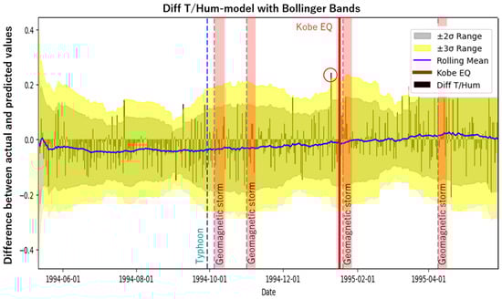 To examine short-term variations, we first focused on the period from May 1994 to May 1995 including the data of the Kobe EQ (17 January 1995). Figure 9 illustrates the AI analysis result, in which we plot the deviation of the actual (observed) values from the NARX/LSTM-predicted values. The ordinate refers to the deviation of the observed value from the predicted value and the grey and yellow areas indicate the Bollinger bands of ±2σ and ±3σ. For the sake of comparison, possible time spans of geomagnetic disturbances which might disturb our results are also indicated by light-red boxes. The date of the typhoon that passed near Kobe is also indicated by a blue vertical dotted line. The model was generated using data from the years of 1990 to 1993. As a result, there were four days as mentioned before during the whole period of about one year when the predicted T/Hum exceeded the +3σ Bollinger band, and one of these days (10 January 1995) with a red circle on the top of the value is endorsed as a possible precursor (7 days before the EQ) to the EQ. The abnormality on this day was greater than that on the other three days.