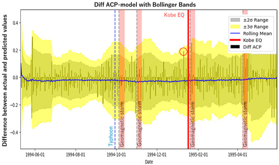 Then, we move on to the corresponding analysis results for ACP in Figure 10, with the same notations as in Figure 7 in the form of the deviation of real values from the AI-predicted values. This figure suggests that an ACP anomaly was confirmed to be observed on the same day of 10 January 1995 during our interest time window of short-term EQ prediction of one month before and two weeks after an EQ. Even though the peak value did not exceed +3σ, we have to emphasize that it was well above +2σ and is approaching +3σ as seen in Figure 10. Another essential conclusion is that this parameter of ACP is an extremely stable indicator of thermal anomalies on the Earth’s surface.