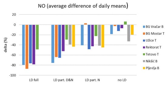 NO2 concentration reductions compared to the time series in the same sites follows a pattern similar to NO (Figure 3). Concentration reductions are, on average, −65% (range: −42%, −81%), −34% (range: −59%, −9%), and −22% (range: −35%, +10%), during the full LD, partial day and night LD, and in night-time LD, respectively. NO2 concentration reductions in the first two subcategories are significantly higher than those observed during the no-LD periods (p < 0.01 and p < 0.02). By comparison, night-time LD levels do not differ significantly from no-LD periods. During the full-LD periods, the average NO2 concentration variation is between −10 µg/m3 and −37 µg/m3. Unlike the background location of Vračar, the sites of Nikšić and Pljevlja show limited differences between the periods with and without LD.
