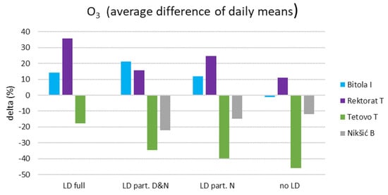 Unlike nitrogen oxides, the O3 levels in traffic sites are the highest during the full-LD and the lowest during the no-LD periods, with values decreasing proportionally with respect to the stringency of the LD (Figure 4). This is explained by the reduced availability of primary pollutants (NO), which reacts quickly with O3 (titration effect) in a chemical regime where volatile organic compounds are the limiting factor, which is the typical situation in urban locations. In one these sites, the differences with the time series are positive and in the other they are negative, a behaviour that has been attributed to the different levels of NO abatement in the two locations. Also, the industrial site presents positive variations in O3 levels compared with the time series in the periods with LD and differences close to zero, when no LD measures are in place. On the contrary, levels in the background location do not change significantly between LD and no-LD periods, in line with the limited variations in NO and NO2 levels observed in this location, which is not directly affected by road transport or industrial emissions.