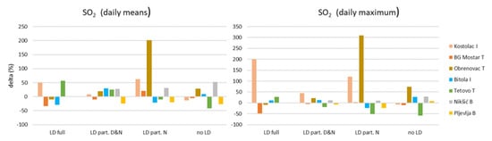 Also, SO2 daily average and maxima were analysed, with particular reference to industrial sites, to assess how LD affected the emissions of this pollutant in coal power plants (Bitola, Kostolac) by comparison with other sites (Figure 6).