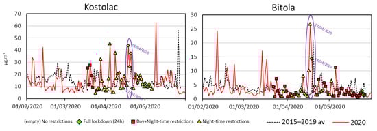 The interpretation of concentrations in industrial locations is different from the other sites. Unlike traffic and heating systems, industrial facilities are point sources, in which plumes are affected by wind speed and direction. As explained in Section 3.3, the decrease in SO2 concentrations in Bitola can be explained by the higher wind speed during the LD compared to the time series used as a reference, while this is not the case for Kostolac. Moreover, limiting the mobility of the population reduces the consumption of electricity in working places, but increases the one in households. For instance, it has been observed that SO2 levels were higher during Easter and in the preceding days (17–18 April 2020) in the industrial sites of Kostolac and Bitola (Figure 7).