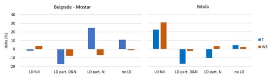 Figure 9 shows that the meteorological situation in Belgrade in 2020 is comparable with the one of the time series during the full-LD and no-LD days (≤10% difference). During the partial LD periods, the average temperatures were either lower (LD part. D&N) or higher (LD part. N). By contrast, both temperature and wind speed are considerably higher during the full LD in 2020, compared to the time series in Bitola. This may have influenced the concentrations of pollutants during the LD in this location, due to lower thermal inversion and higher dispersion. In this case, the effect of LD could be overestimated, due to the impact of meteorological conditions. Similar to Belgrade, lower temperatures accompanied the partial LD (LD part. D&N) in Bitola. In this case, the effect of restrictions in reducing the emission of pollutants could have been compensated by higher thermal inversion and lower dispersion. In addition, lower temperatures are correlated with a higher use of heating systems.