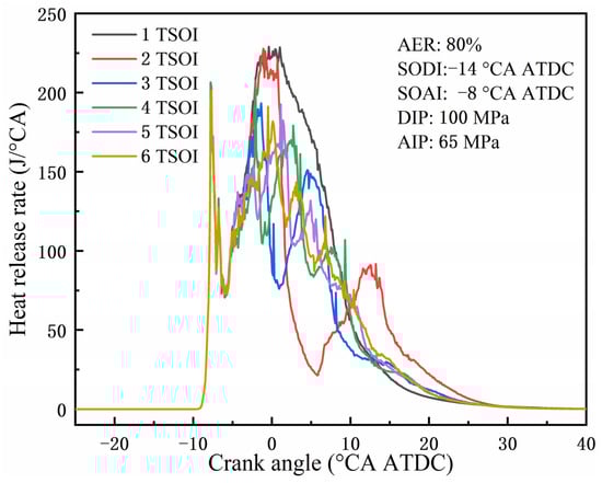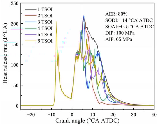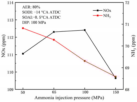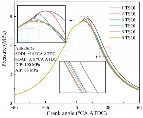 - Advancing the SOAI timing to −8 °CA ATDC leads to earlier injection of ammonia, allowing it to interact more effectively with the diesel-dominated combustion process, thereby improving overall combustion efficiency. The peak cylinder pressure has significantly increased, and the peak phase shifts forward as TSOI increases, but oscillates within a certain range. Advancing the SOAI timing has an improvement effect on later combustion. When TSOI = 2, the heat release shows a clear bimodal pattern, while the heat release rate at SOAI = −0.5 °CA ATDC only shows a unimodal pattern. The overall N2O and NOx emissions have increased, while unburned NH3 emissions have decreased. But when SOAI advanced to −8 °CA ATDC, NOx showed a decreasing trend with the increase of TSOI, and the reduction was not small. When TSOI = 3, NOx emissions reached their lowest point, which was more than 50% lower than a single ammonia injection.