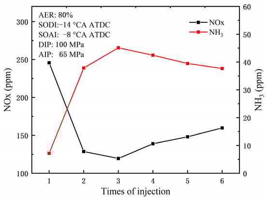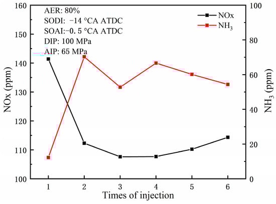 - Niki, Y.; Nitta, Y.; Sekiguchi, H.; Hirata, K. Diesel fuel multiple injection effects on emission characteristics of diesel engine mixed ammonia gas into intake air. J. Eng. Gas Turbines Power 2019, 141, 061020. [Google Scholar] [CrossRef]