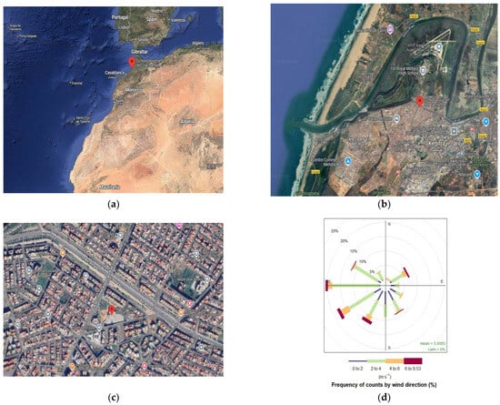 Location of the air pollutant measurement site in Kenitra (red pin) in the Atlantic region (panel (a)) next to the main road linking the city center to Mehdia beach and not far from the air base (panel (b)), not far from Kenitra city center (panel (c)). Wind rose map based on hourly averages of wind speed and direction (panel (d)). Note the different map scales.