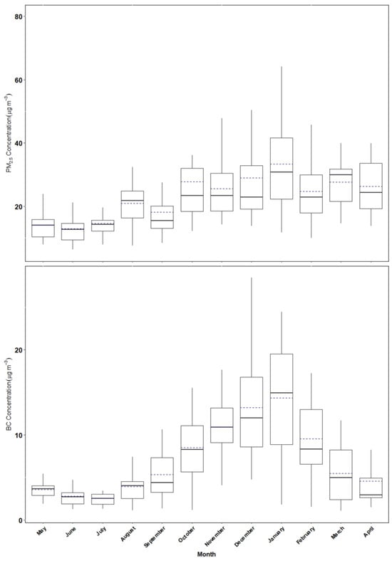 The monthly variation in PM2.5 concentrations in Kenitra (Figure 2) demonstrates significant seasonal variations (one-way ANOVA test, p-value < 0.001). Monthly PM2.5 concentrations show relatively seasonal dependent levels throughout the year, ranging from a minimum of 12.6 ± 4.2 µg/m3 in June to a maximum of 33.8 ± 14.7 µg/m3 in January. The overall mean concentration of PM2.5 was 22.9 ± 11.6 µg/m3. A similar trend was observed for BC levels, with a maximum concentration of 14.6 ± 6.4 µg/m3 in January and a minimum of 2.6 ± 0.9 µg/m3 in July, reflecting the seasonal variability of these pollutants. Several factors contribute to the elevated levels of PM2.5 and BC in Kenitra, particularly during the winter months, including increased traffic-related activities. Previous studies have found that local sources, such as vehicle emissions, socio-economic activities, and industry-related combustion strongly influence BC levels and their variability in Kenitra []. These are also closely linked to meteorological conditions, such as boundary layer height. For PM2.5, variations are driven by a combination of local atmospheric conditions and the contribution of regional and long-range emission sources []. Winter months in coastal cities such as Kenitra are characterized by lower temperatures and diminished wind activity, which contribute to the stagnation of pollutants near the surface (Table 1) []. This trend in BC pollution during winter is consistent with findings from studies conducted in other urban areas, where increased vehicular emissions are linked to elevated levels of BC levels [,,,].