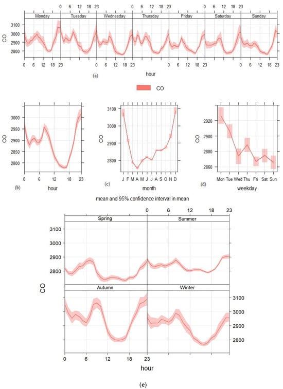 Figure 3c presents the monthly variation in average CO concentrations, showcasing a U-shaped pattern. The lowest concentrations, around 2750 ± 67 µg/m3, occur between April and August. From September onwards, CO levels gradually increase, peaking at approximately 3050 ± 227 µg/m3 in December. This seasonal trend is influenced by winter weather conditions, which often lead to stagnant atmospheric conditions, low wind speeds, and reduced temperature inversions. These meteorological factors hinder the dispersion of pollutants, resulting in elevated CO concentrations and poor air quality events []. The correlation between CO levels and colder months suggests that atmospheric conditions, such as temperature inversions, play a critical role in trapping pollutants close to the ground, exacerbating air quality issues [].