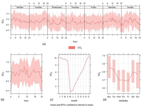 An hourly analysis of SO2 concentrations revealed relatively stable levels throughout the day, with slight fluctuations (Figure 4b). Similarly, the day-of-the-week distribution showed minimal variation, ranging from 6.7 ± 3.5 µg/m3 on Friday to 6.9 ± 3.7 µg/m3 on Monday (Figure 4d). Hourly comparisons across the week further emphasized this consistency, with concentrations averaging around 7 ± 4 µg/m3 (Figure 4a).